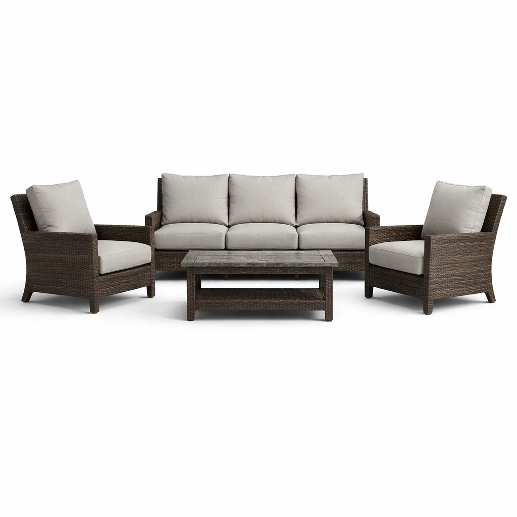 Material: Estructura de acero, ratán sintético, cojines de poliéster.